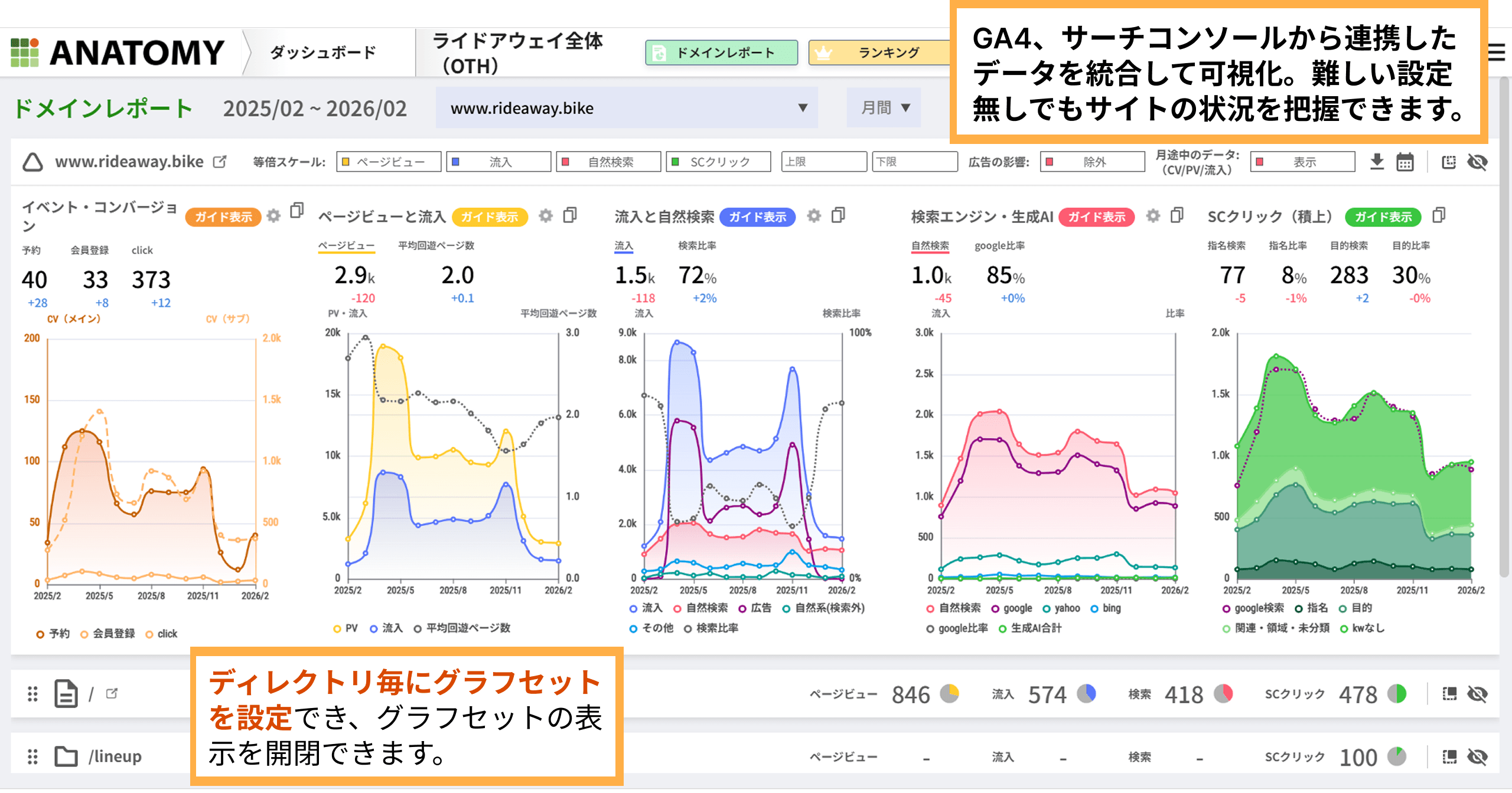 弊社が開発しているWebサイト分析ツール「ANATOMY(アナトミー)」も同様の立ち位置のツールです。GA4のデータを連携、可視化することがでます。無料プランでもダッシュボード機能は使用できるので、是非試してみてください。