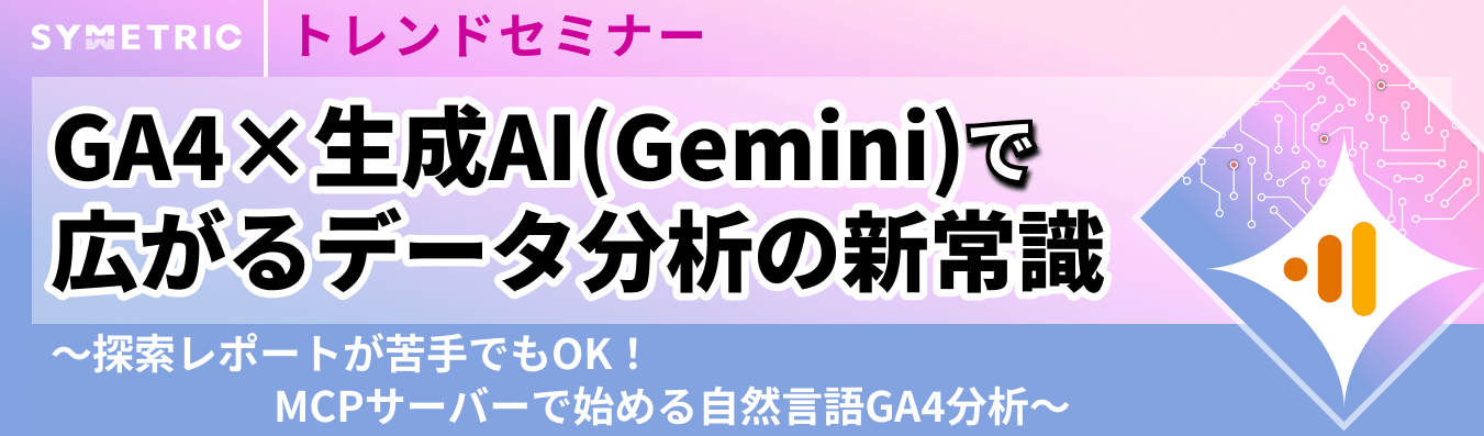 本セミナーでは、従来の手法を整理したうえで、MCPサーバーを活用した「GA4 × AI」の最新分析手法を解説します。自然言語による指標出力のデモを通じ、日常業務を効率化する具体的な活用イメージを体感いただけます。
