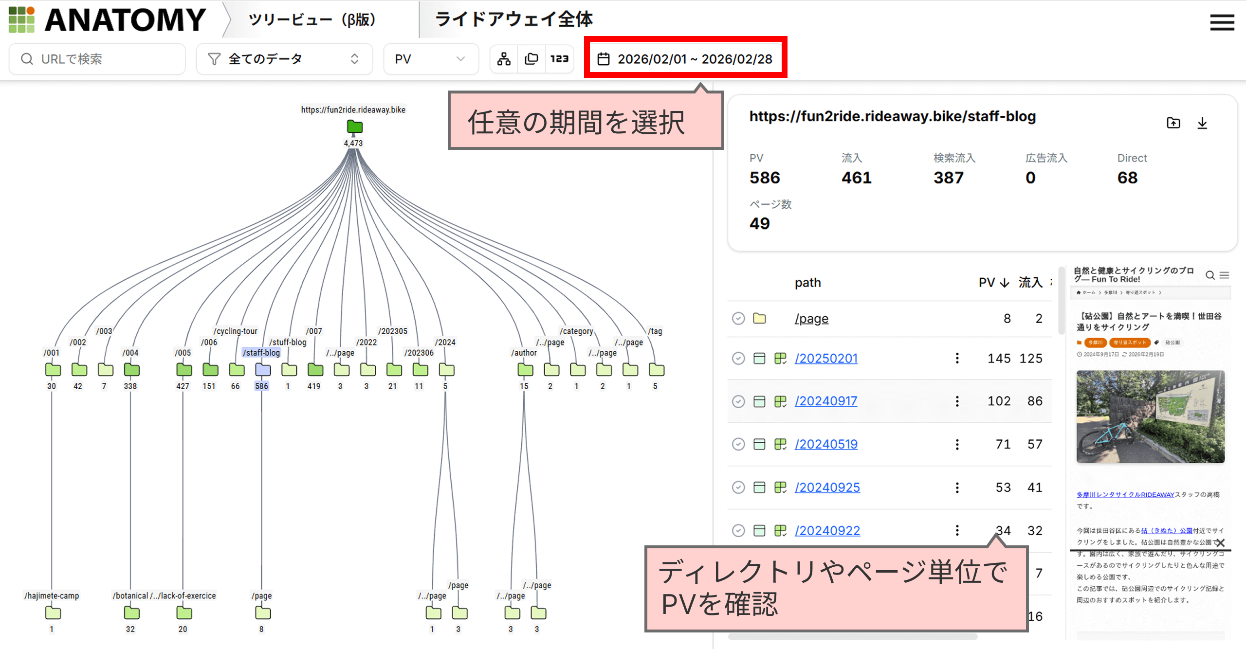 GA4で特定の期間を計測するのは手間がかかりますが、Webサイト分析ツール「アナトミー」なら、右上のカレンダーから任意の期間を選ぶだけで、サイト構造を再現した「ツリービュー」上に各ページのPV数が即座に反映されます。
